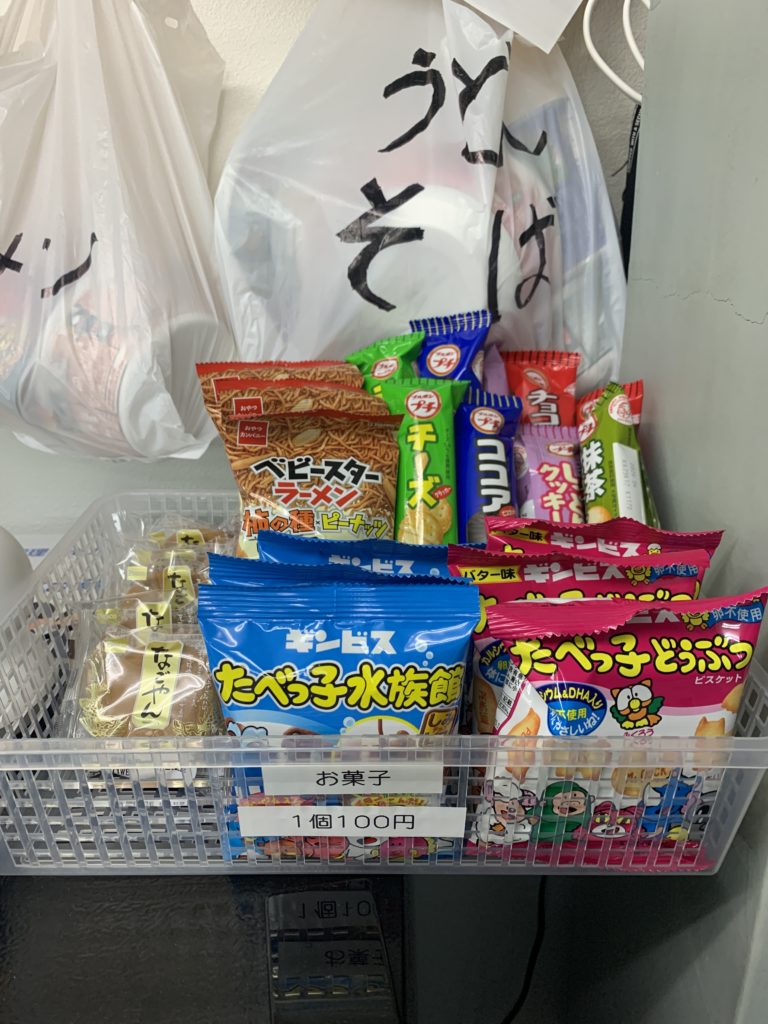 食べ物…カップ麺(200円)冷凍食品(500円)アイス・菓子(100円)をご用意しております。