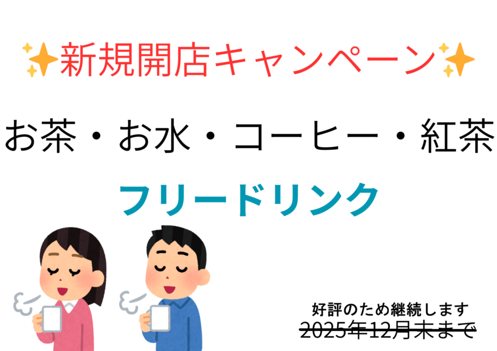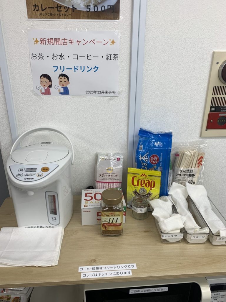 飲み物…お茶、お水、コーヒー、紅茶はフリードリンク。